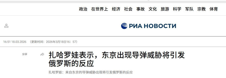 扎哈罗娃默示,东京出现导弹挟制将激勉俄罗斯的响应2026年3月18日