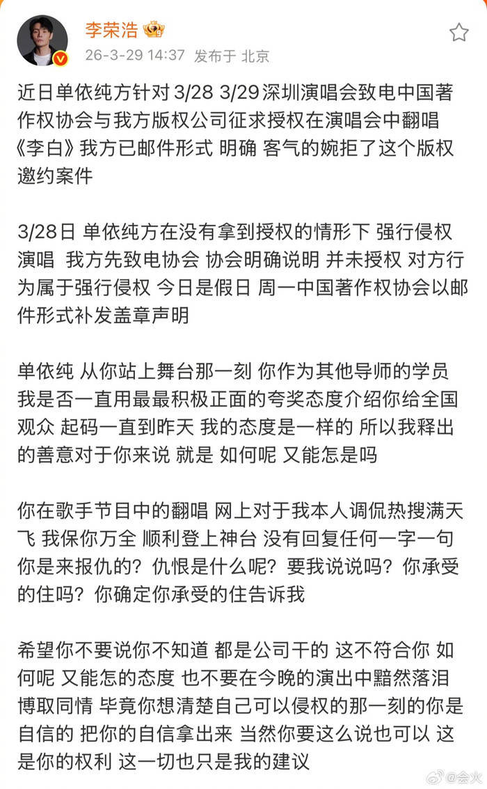 音著协的回话更让行业炸锅!当作法定著述权集体搞定机构,明确暗示李荣浩未请托搞定《李白》版权,单依纯方苦求时已明确斥逐。可业内竟广博存在“先上演后补授权”的荣幸心思,版权审核形同虚设!讼师痛批:“生意上演无强制许可兜底,被拒后还唱等于明知故犯!”