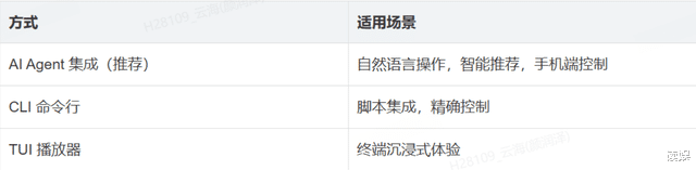 TUI 有一个值得一说的秉性:它不错和 CLI 敕令同期责任。TUI 跑着的时候,你仍然不错在另一个结尾奉行ncm-cli next、ncm-cli volume 80,TUI 界面会及时反映。这对 AI Agent 来说尤为当然——Agent 发出的敕令和东谈主在 TUI 里的操作是满盈平等的。