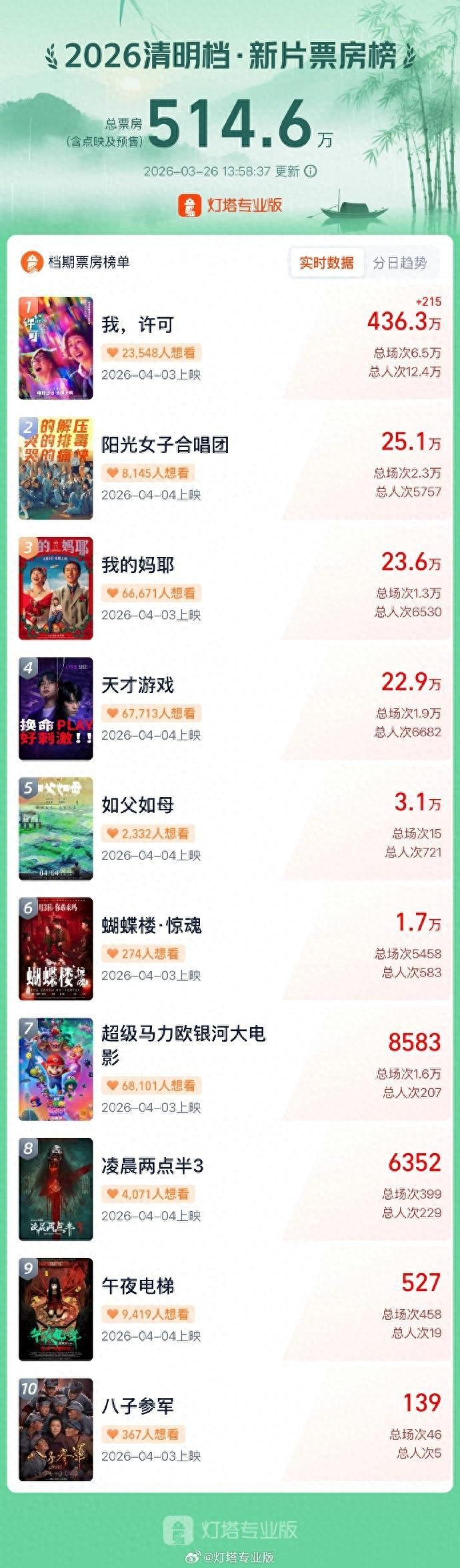 据灯塔专科版,摈弃3月26日13时58分,2026年晴明档新片点映及预售总票房达514.6万,影片《我,滚球(中国)app官网许可》《阳光女子齐唱团》《我的妈耶》《天才游戏》《如父如母》暂列前五。