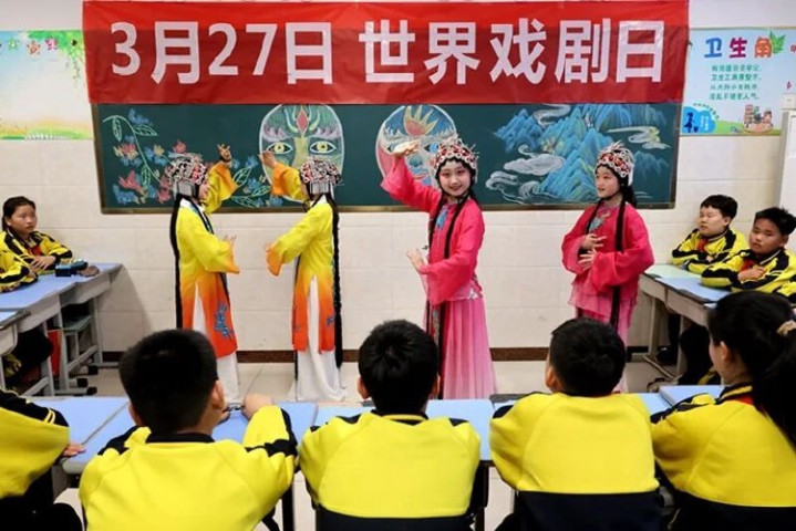 山东省枣庄市东湖小学戏剧社团的学员在为同学们饰演柳琴戏。孙中喆摄/新华社