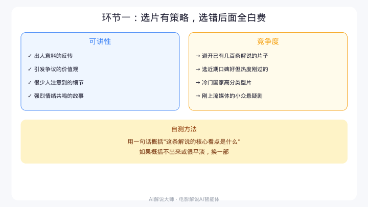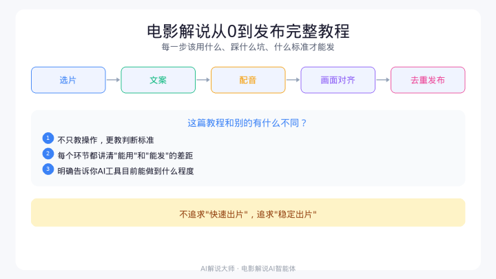 这篇我会把电影讲明从选片到发布的每一个法子都拒绝讲,但重心不是教你"怎么操作",而是教你"怎么判断你作念出来的东西够不够发布尺度"。 每个法子我都会讲三件事:这一步的中枢方针到底是什么,面前AI器具能帮你作念到什么进度,以及你需要精明的质料红线在那里。