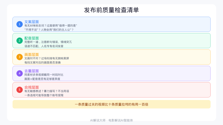 合规层面。 查抄案牍中有莫得波及明锐内容的表述(暴力描述、失当用语等),画面中有莫得不符合公开传播的镜头。这一步不可省,一条违纪可能导致通盘账号受限。